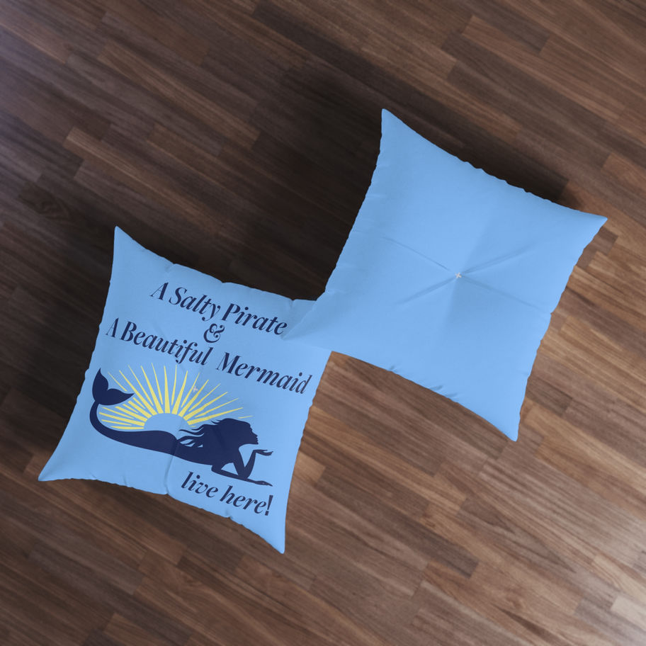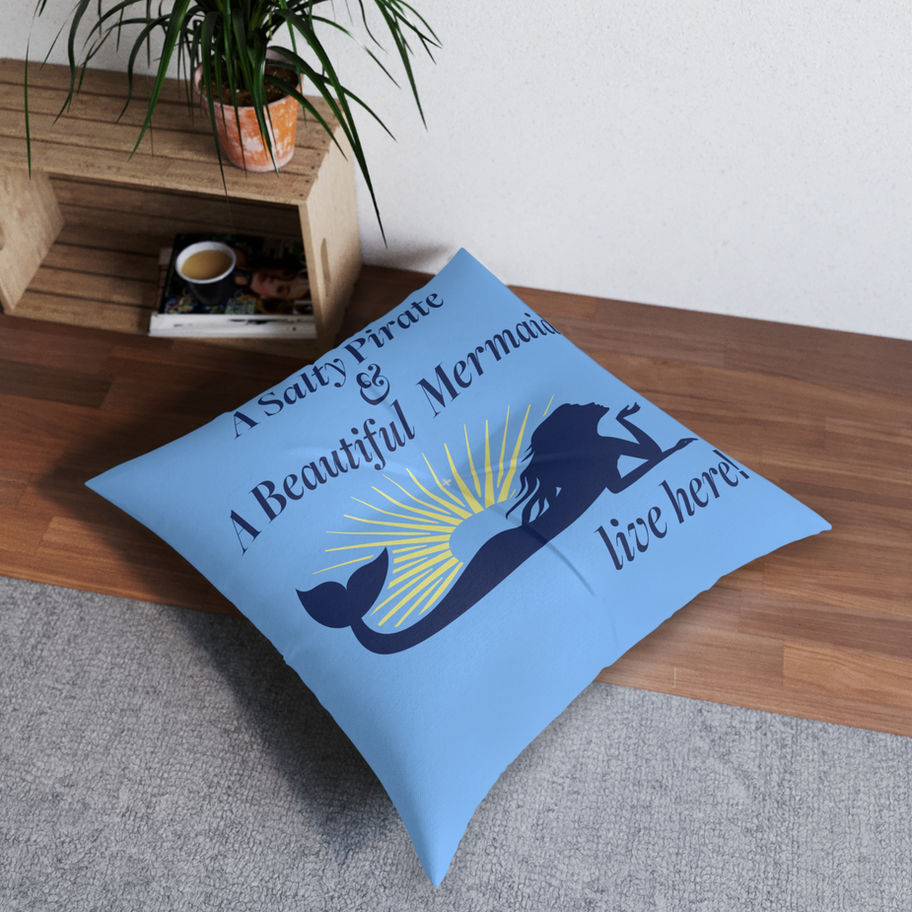 The pillow is crafted from the softest, ocean-blue, reminiscent of the deep, enchanting waters where the two worlds of pirates and mermaids often intertwine. It's generously sized, as large as a treasure chest, perfect for lounging pirates and mermaids alike.